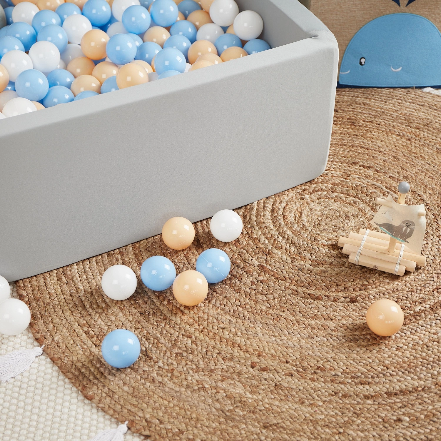 Plastične loptice izrađene su od netoksičnog materijala bez BPA i ftalata, imaju glatku površinu bez oštrih rubova, otporne su na deformacije, a istovremeno elastične za tihi doskok. Lako se čiste i bez mirisa su, pa se odlično održavaju u čistoći u dječjoj sobi i igraonici. Na izbor su različiti promjeri (npr. 6–7 cm) i setovi od 50, 100, 200 ili 300 kom – idealne loptice za bazen s lopticama, dječju sobu i dječji šator, točno prema veličini prostora.