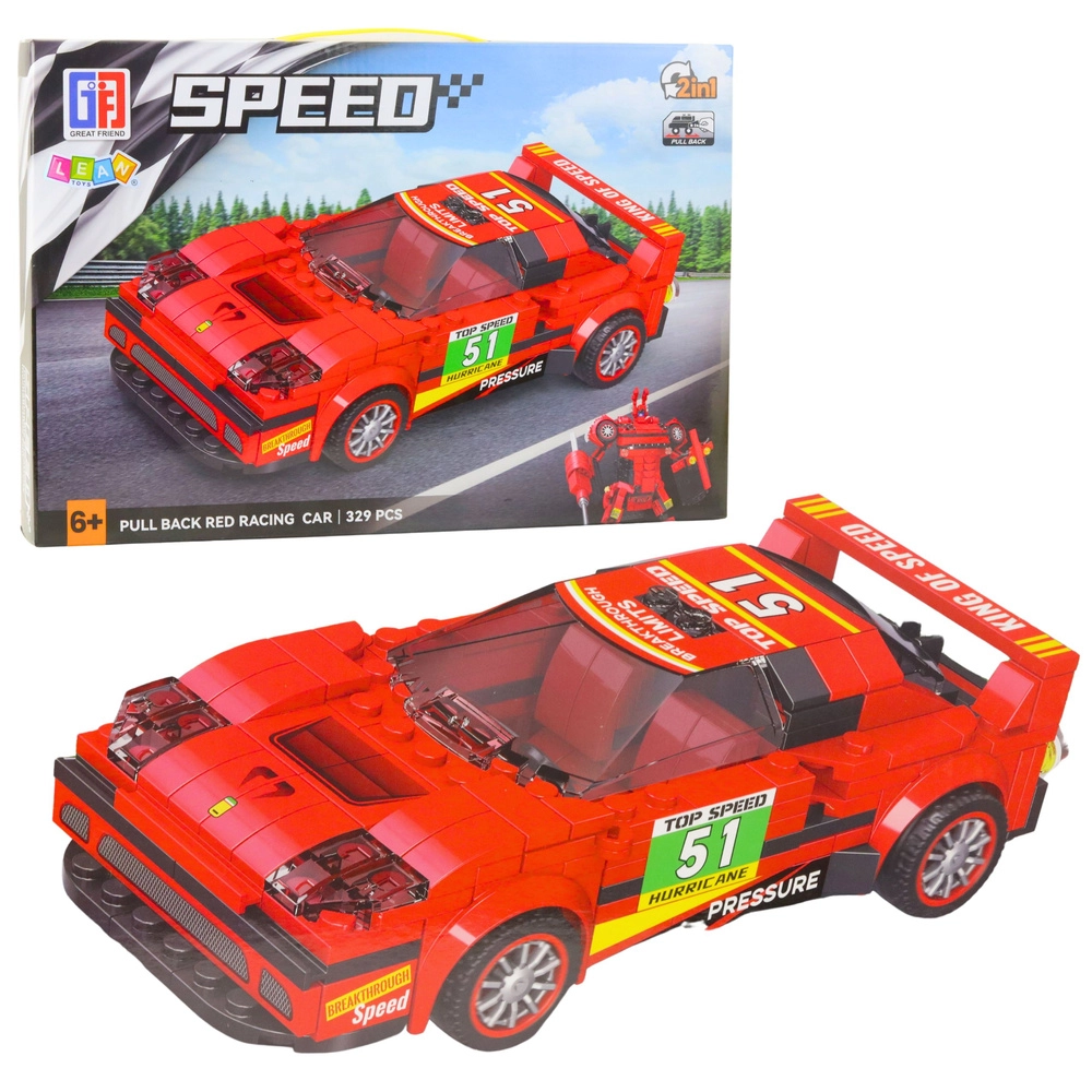 Konstrukcijski set 2u1 trkaći auto i robot s navijačkim (pull-back) pogonom, 341 dijelova – crvena