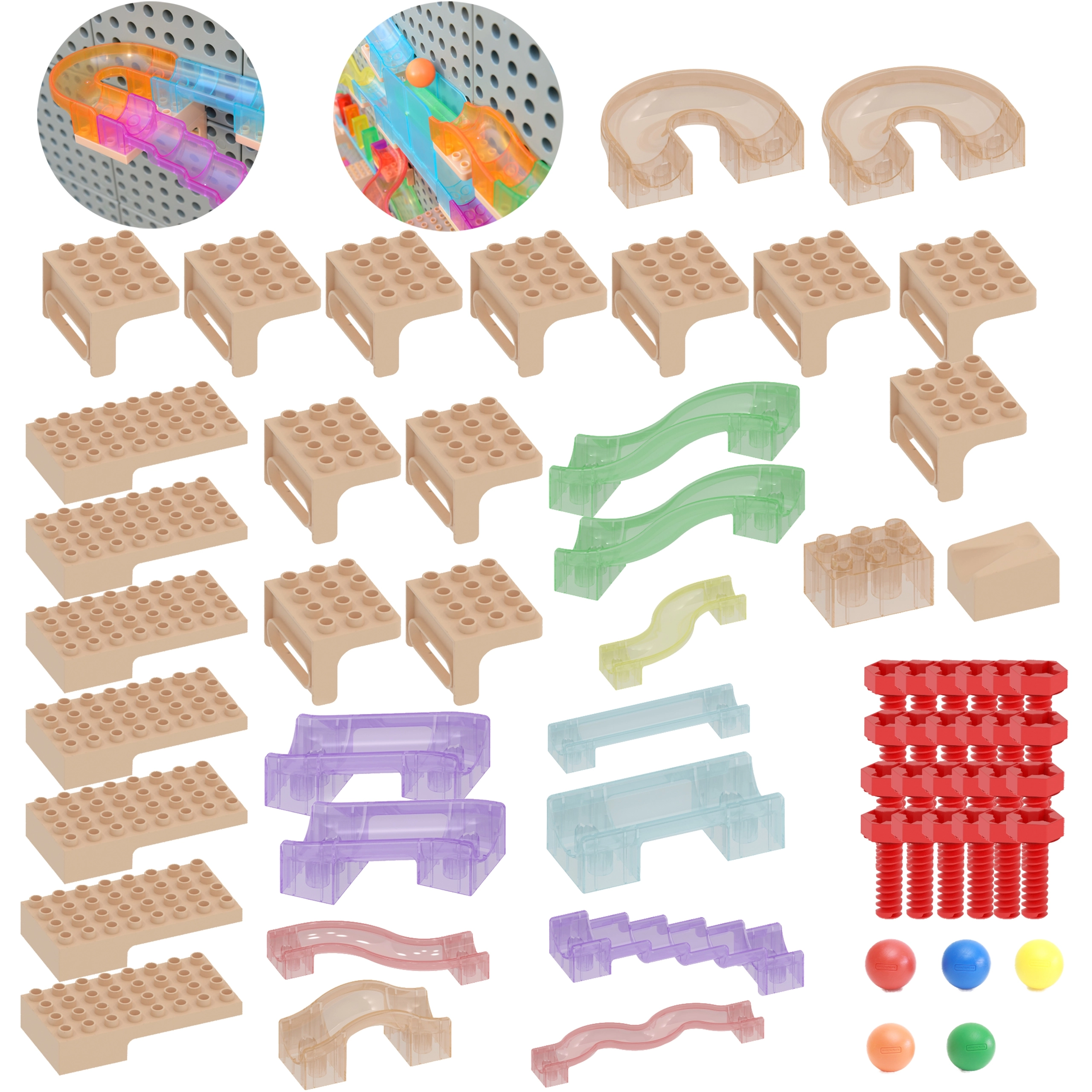 Modularni sustav dijelova omogućuje beskrajne kombinacije: ravnine, zavoje, lijevke i skokove za brzu ili sporu vožnju kuglica. Dijelovi se lako povezuju, konstrukcija zadržava oblik i prilagođava se različitim visinama i nagibima. Cijenit ćete jednostavno spajanje, čvrstu konstrukciju, kvalitetnu izradu i sigurne materijale – idealno za dugotrajnu igru.
