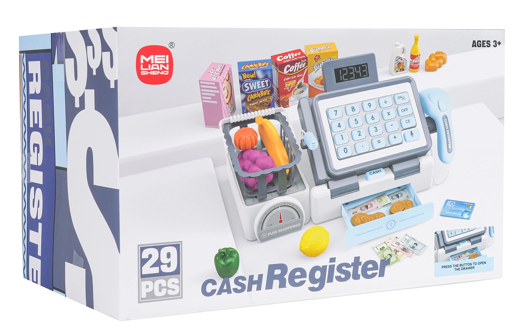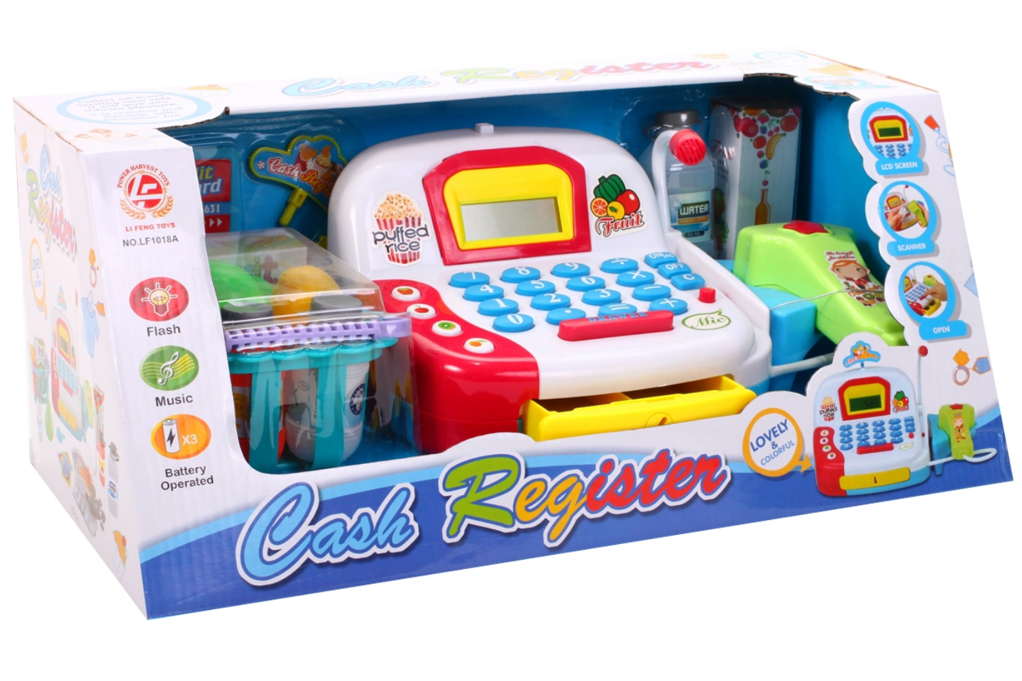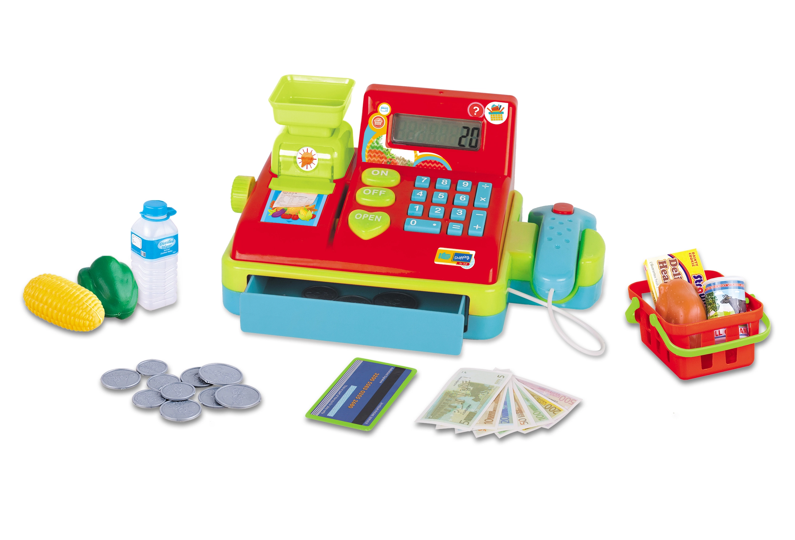 Dječje blagajne nude čitač crtičnog koda i skener, terminal za kartično plaćanje, novčanice i kovanice, kalkulator, mikrofon te svjetlosne i zvučne efekte – idealno učenje kroz igru i trening rada na blagajni. Zahvaljujući njima djeca uče računati, razvijaju komunikaciju s kupcem i financijsku pismenost. Namirnice za dječju trgovinu (voće, povrće, peciva, kutijice ili limenke) od drva, plastike i tekstila, često na čičak ili s magnetom, potiču maštu i finu motoriku.