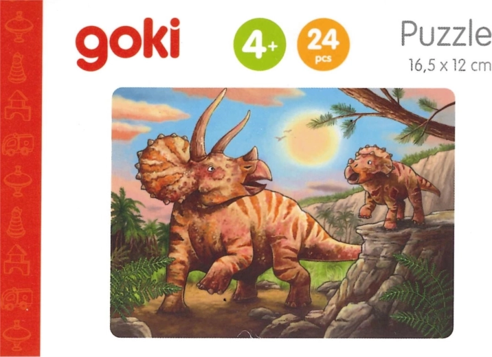 Dječje drvene puzzle s motivom prapovijesnih dinosaura. Sastavljanje puzzli razvija maštu i potiče razvoj motorike. Preporučeno za djecu od 4 godine. GOKI spada među najznačajnije europske proizvođače igračaka s visokom pedagoškom i didaktičkom kvalitetom. Tvrtka naglašava sigurnost igračaka, njihovu zdravstvenu ispravnost i brigu o obnovljivim izvorima. Drvo se nabavlja tamo gdje se može obnoviti. Korištene vrste drva su javor, bukva, orah, lipa, jasen, bor, breza i gumovac. Boje i lakovi dolaze od manjih proizvođača.