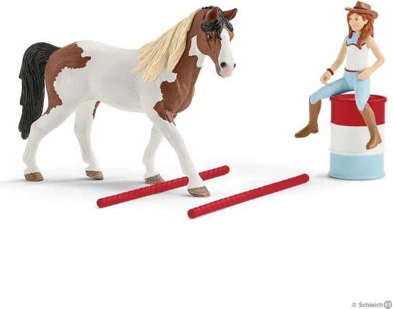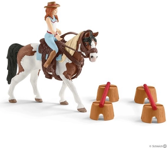 Zapadnjački jahački set Hannah donosi u dječju sobu atmosferu barrel racing natjecanja. Set nudi raznobojne bačve i niske prepreke koje se mogu slobodno rasporediti, pa dijete lako stvara vlastitu jahaću stazu. Zahvaljujući uklonjivom sedlu i uzdi Hannah može konja pripremiti za trening i utrku.