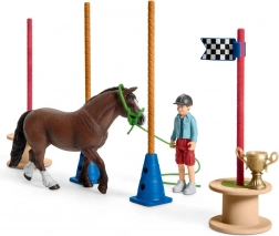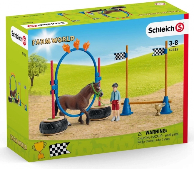 Pripremite svog velškog ponića za utrku u agilityju i provjerite može li savladati sve prepreke s lakoćom. Ovaj set sadrži sve što vam treba za realističan trening doživljaj, uključujući figuricu dječaka, jahaču kacigu i prepreke s zastavicama start-cilj. Detalji su tipični za Schleich i približavaju život na selu.