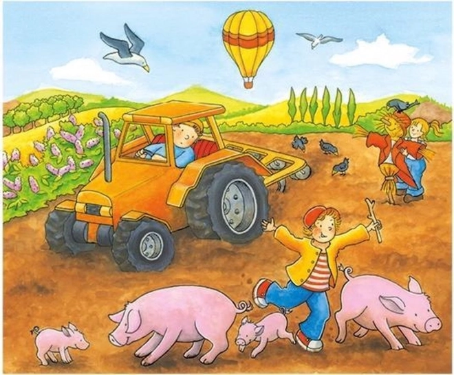 Složite scene s traktorom, djecom i životinjama. 12 kocki stvara 6 cjelina i vježba prepoznavanje oblika, boja i logičko slaganje.