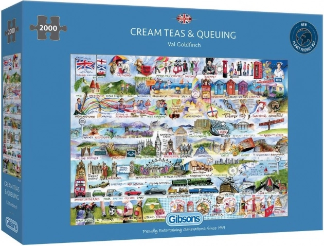 Otkrijte čaroliju britanske tradicije s kvalitetnim puzzleom GIBSONS. Ova detaljna slagalica s motivom krem čajeva nudi 2000 dijelova, a nakon slaganja ima dimenzije oko 98 × 68 cm. Izvrsna opcija za ljubitelje čaja, Engleske i zahtjevnijih slagalica.