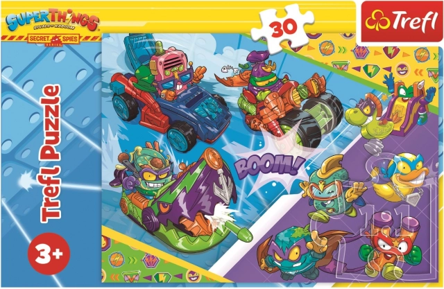 Dječje puzzle s motivom SuperThings: ekipa super špijuna donose zabavu i razvoj vještina za najmlađe. Sadrže 30 dijelova, preporučeno od 3 godine, a nakon slaganja imaju dimenzije oko 27 × 20 cm – idealno za prvo slaganje te vježbanje fine motorike i koncentracije.