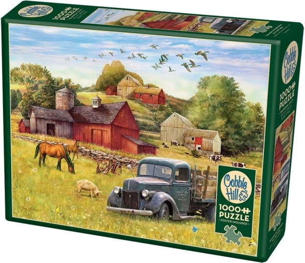 Na slagalici je prikazana očaravajuća scena farme s crvenom šupom, starim kamionom i životinjama koje pasu na livadi.