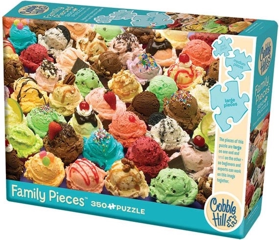 Obiteljska slagalica COBBLE HILL – Sladoled osmišljena je tako da u slaganju mogu uživati svi, bez obzira na dob. S jedne strane motiva nalaze se veliki dijelovi idealni za mlađu djecu, s druge strane mali dijelovi za odrasle i iskusnije slagatelje, a u sredini srednji dijelovi prikladni za stariju djecu i bake i djedove.