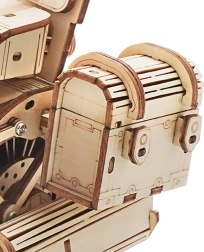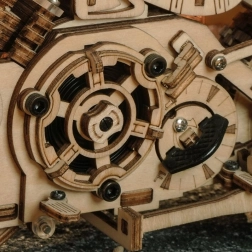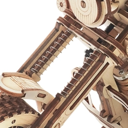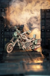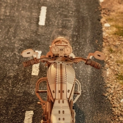 Ovaj drveni mehanički motocikl izvrstan je izbor za sve koji vole dizajn, tehniku i dobar ručni rad. Navijni opružni mehanizam s okidačem pokreće model u živahnu vožnju, dok funkcionalan upravljač omogućuje djelomično vođenje smjera. Realističan rad motora lijepo upotpunjuju kretanje klipova i radna suspenzija prednje vilice.