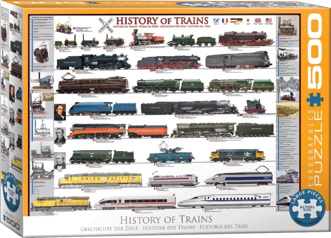 Otkrijte fascinantan svijet željeznica s ovim kvalitetnim puzzleima EUROGRAPHICS. Slikovnica donosi motiv povijesnih vlakova, a zahvaljujući XL dijelovima idealna je za udobno slaganje. Tekstovi na motivu su na engleskom. Dimenzije gotove slike su cca 67,63 × 48,89 cm. Uživajte u opuštanju i zabavi te usput naučite nešto novo o povijesti željeznice – sve u jednom pakiranju. XL dijelovi, edukativni motiv, kvalitetan tisak i veliki format za sjajno iskustvo slaganja.