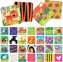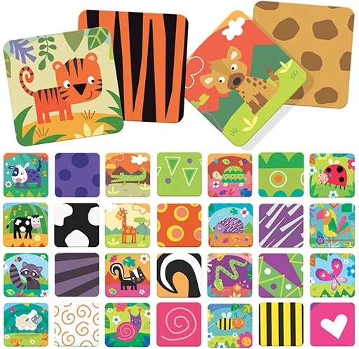 Set sadrži 50 kartica (25 parova) s logičnom podjelom životinja prema okruženju: livada, prašuma, savana, šuma i farma. Zahvaljujući tvrđim i izdržljivim kartama te izražajnim bojama i oblicima igra je privlačna i dugotrajno upotrebljiva. Nudi više varijanti igranja i izvrsno odgovara za predškolsku djecu u dobi 3–6 godina.