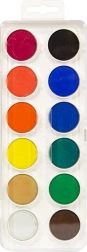 Plastična pravokutna kutija je lagana, izdržljiva i praktična za nošenje u školu ili atelje. Set od 12 boja pokriva osnovnu paletu za slikanje na papiru, kartonu ili akvarel blokovima.