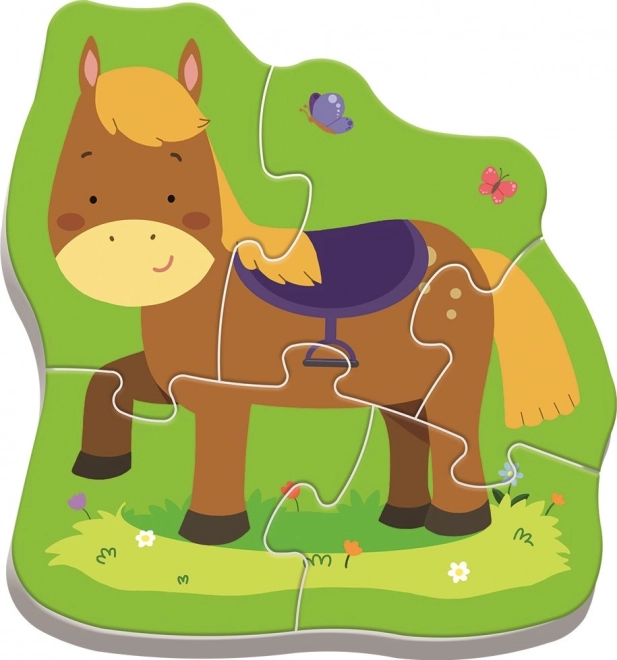 Puzzle s motivom životinja sa farme nude zabavnu i edukativnu aktivnost za vašu djecu. Ovaj set sadrži 18 komada od kojih se mogu složiti 4 različite slike životinja: konja, kravice, pilića i praseta. Uz njihovu pomoć djeca uče prepoznati životinje i uvježbavaju brojanje.