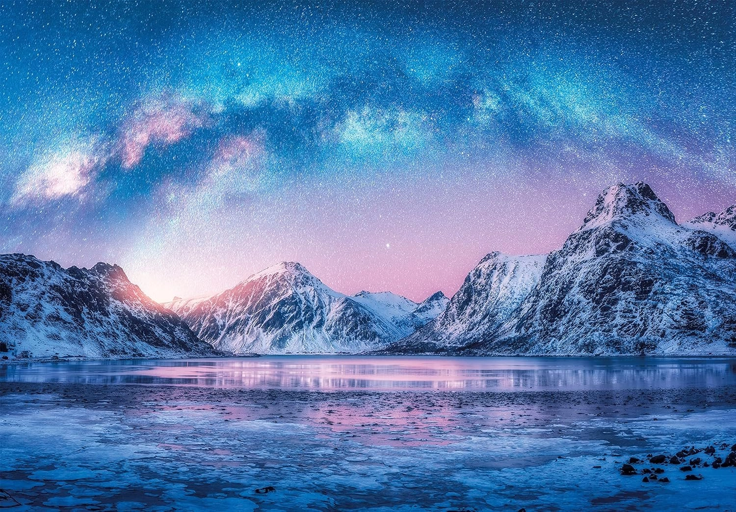 - Planine, jezero i zvjezdano nebo u tonovima light blue