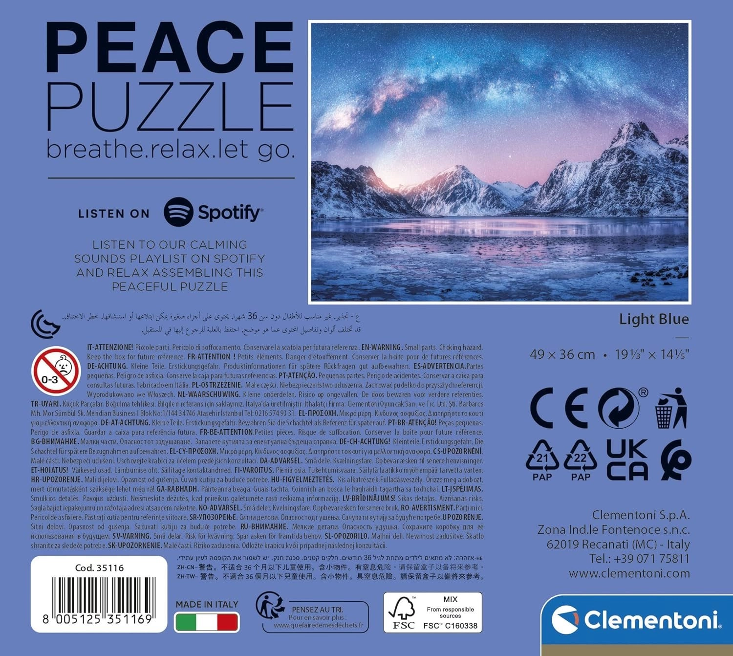 Uživajte u trenucima mira s puzzlama CLEMENTONI Peace Collection Light Blue. Vrhunski dijelovi od kvalitetne, debele kartonske podloge savršeno se uklapaju, a motiv mirnog nordijskog krajolika sa svjetlucavim nebom stvara idealnu atmosferu za meditativno slaganje.