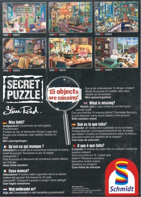 Puzzle Tatina radionica iz Secret kolekcije brenda Schmidt donosi 1000 dijelova zabave i napetosti s 15 skrivenih tajni koje čekaju da budu otkrivene.