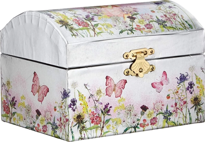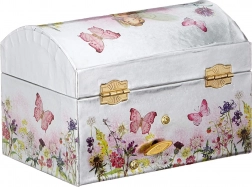 Ova kutija za nakit u stilu glazbene kutije spaja privlačan izgled i funkcionalnost. Srebrna sjajna izvedba upotpunjena je nježnim cvjetnim i leptirovim motivima, a iznutra se nalazi ovalno ogledalo i rotirajuća balerina. Po otvaranju poklopca oglašava se slavna melodija Labuđeg jezera, koja prati svako odlaganje prstena ili naušnica na sigurno.