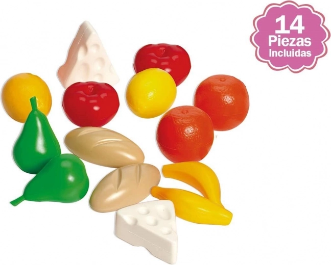 Uključene su plastične namirnice, uključujući voće (kruške, jabuke, banane) i druge komade za raznoliku igru.
