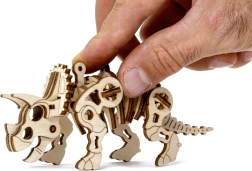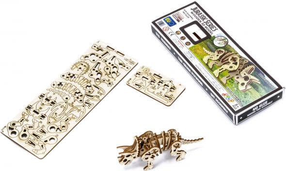 Drvena mehanička slagalica iz Jurske serije Triceratops namijenjena je ljubiteljima prapovijesnih stvorenja. Nakon sastavljanja model oživljava u vašim rukama, ima pokretnu glavu i udove. Zahvaljujući jedinstvenom dizajnu i iznenađujućim detaljima ovog modela, vaše će slaganje biti puno zabave. 3D puzzle WOODEN CITY Jurassic Series Triceratops izvrstan je poklon za svakog ljubitelja dinosaura. Težina: 2 od 5 (prema podjeli Wooden City) Okvirno vrijeme sastavljanja: 1 sat Mjerilo: 1:70 Drvene 3D puzzle WOODEN CITY su detaljno razrađeni funkcionalni mehanički modeli koji se sastavljaju bez ljepila ili alata. Izrađene su od ekoloških drvenih materijala – kvalitetne brežove šperploče. Uz mehaničke drvene puzzle WOODEN CITY doživjet ćete sate zabave pri sastavljanju i iz neposredne blizine upoznati prijenose, gumene motore, zupčanike i druge komponente. funkcionalni mehanički model sastavljanje bez upotrebe ljepila ili alata kvalitetna izrada od prirodnog materijala razrađeni detalji priložene slikovne upute na unutarnjoj strani ambalaže nalaze se QR kodovi za prikaz uputa i instruktivnog videa UPOZORENJE: Za sastavljanje su potrebni lomivi nožić, škare, brusni papir i voštana svijeća (nisu dio proizvoda). Za ispravan rad i nesmetan pogon potrebno je navoskirati pokretne dijelove modela. Dimenzije sastavljene slagalice cca 13 x 3,9 x 5,6 cm