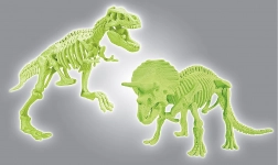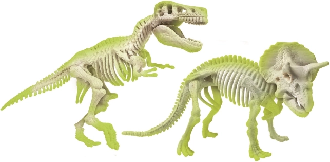 Fluorescentni dijelovi kostura upijaju dnevno svjetlo i u mraku sjaje. Gotovi modeli T‑Rexa i Triceratopsa efektnan su ukras i edukativno pomagalo.