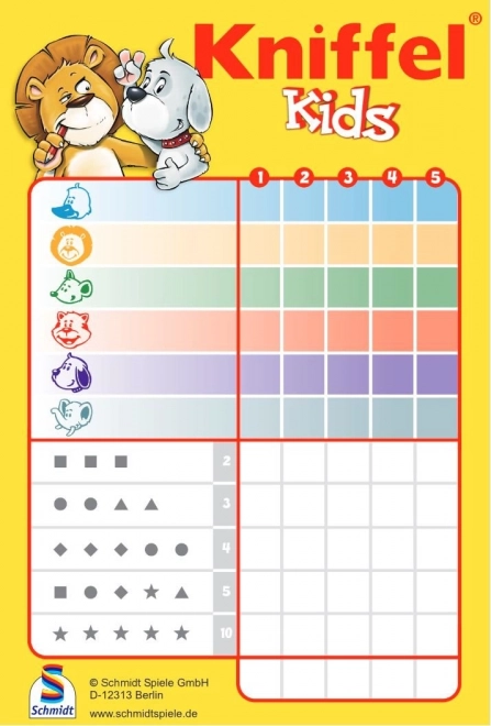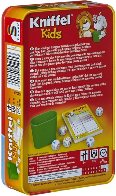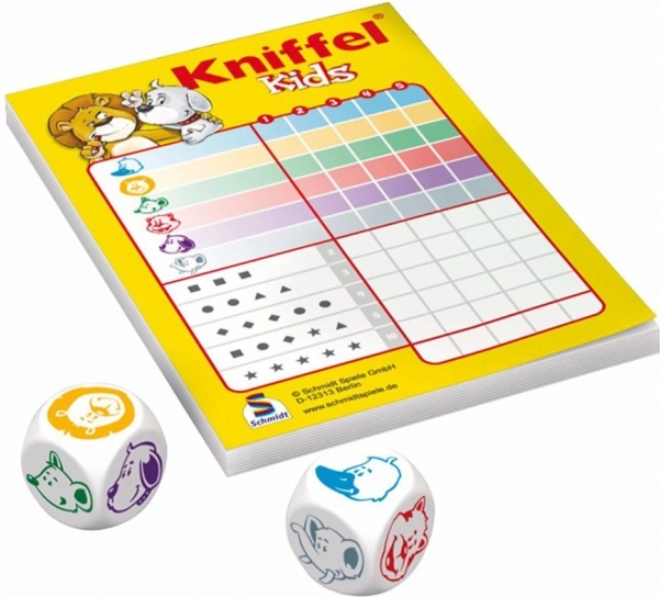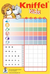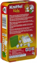 Kniffel Kids je omiljena obiteljska igra u dječjoj verziji koja razvija opažanje, logiku i jednostavno računanje. Igrači bacaju kocke sa životinjama, nastoje složiti što povoljnije kombinacije i upisuju rezultate u priloženi blok. Zahvaljujući čvrstoj limenoj kutijici, igra je odlična za izlete, godišnji odmor i odlazak u restoran.