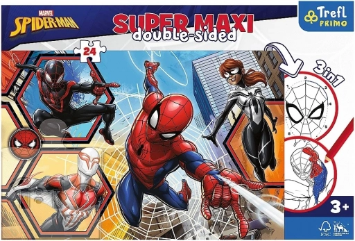 Dvostrana slagalica Super Maxi sa svijetom SPIDER-MANA nudi djeci čak tri aktivnosti u jednome: slaganje velikog formata slike, bojanje i jednostavnu igru. Zahvaljujući 24 velikim dijelovima slaganje je intuitivno i pristupačno i za manju djecu, a gotova slika ima dimenzije oko 60 × 40 cm.