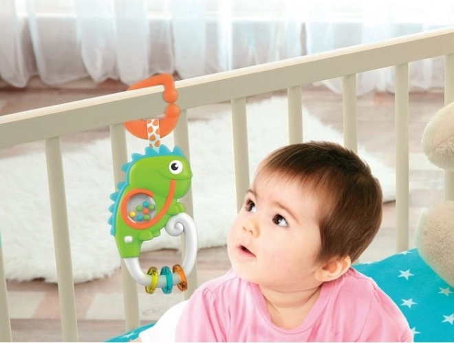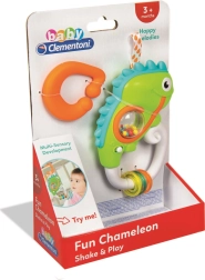 Zabavna interaktivna zvečka u obliku veseloga kameleona razveselit će najmlađu djecu kod kuće i na putovanjima. Može se lako objesiti na krevetić, kolica ili autosjedalicu. Nudi svjetlosne i zvučne efekte s melodijama, zveckajuće kuglice i prstenove za stimulaciju osjetila i razvoj fine motorike. Izrađena je od kvalitetnih, sigurnih materijala za prvo otkrivanje svijeta.