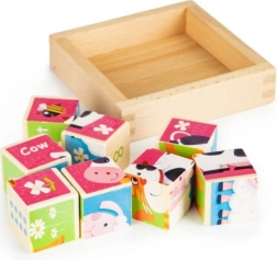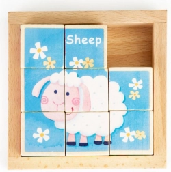 Ovaj set od 8 čvrstih drvenih kocaka ECOTOYS donosi sate smislenog veselja. Djeca mogu složiti 3 simpatične slike – ovčicu, kravu i mačku – i istovremeno učiti njihove engleske nazive. Stranice s brojevima prikazuju brojke u tri oblika: arapske znamenke, rimske brojke i točkice kao na igraćoj kocki.