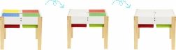 Dvobojna, okretna i izvadiva ploča sastoji se od dva dijela: jedna je strana kompatibilna s kockama i potiče kreativno slaganje, a druga je glatka za crtanje, pisanje i izradu. U sredini ćete pronaći 4 prostrana koša u koja djeca mogu pospremiti kocke, bojice, papire i knjižice – pospremanje je pitanje trenutka.