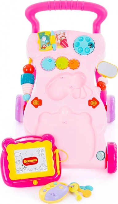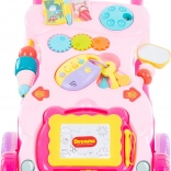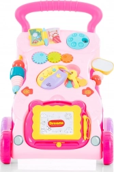 Sastavni dio su ploča za crtanje s olovkom, ogledalce, šareni zupčanici, gumbi i ključevi s „pametnim” daljinskim. Odvojive igračke mogu se koristiti i zasebno, što produžuje zabavu i potiče kreativnost. Hodalica reproducira svjetla, melodije i zvukove, čime potiče sluh, vid i koncentraciju. Pakirano u poklon-kutiji – odlična ideja za dar.