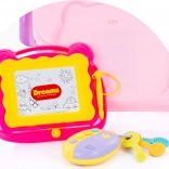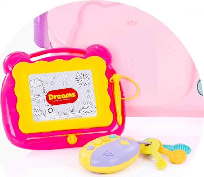 Ploča za crtanje s olovkom, zupčanici, gumbi, ogledalce i ključevi s daljinskim razvijaju finu motoriku, vid i sluh.