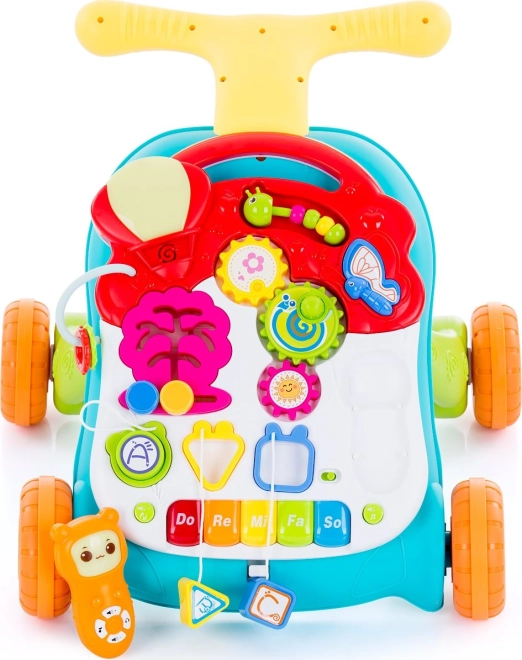 Interaktivni panel reproducira melodije i zvukove, potiče na pritiskanje tipki i okretanje kotačića. Odvojivi glazbeni pult i mobilni telefon mogu se koristiti samostalno, kod kuće i na putovanjima. Ručku lako podesite po visini kako bi djeci bilo ugodno i sigurno gurati.