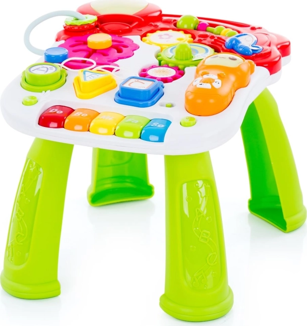 Stolić nudi tipke, zupčanike i mini klavijaturu s notama koji podupiru finu motoriku, koordinaciju ruka–oko i osjećaj za ritam.