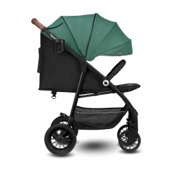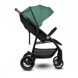 Sigurnost osiguravaju 5-točkasti pojasevi i odvojiva zaštitna prečka koja definira prostor za dijete i olakšava ulazak. Glatko, beskoračno podešavanje naslona do ležećeg položaja i podesivi oslonac za noge brinu za ergonomiju. Veliki EVA kotači s potpunim ovjesom ublažavaju neravnine, zakretni prednji kotači (360°) mogu se zaključati za ravnu vožnju, a centralna kočnica daje sigurnost pri zaustavljanju.
