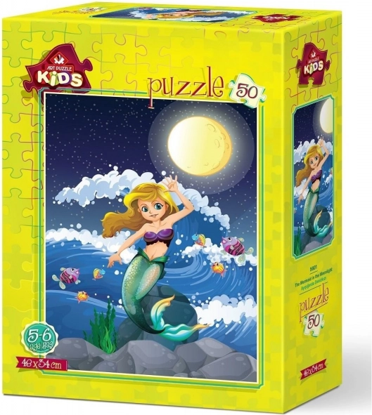 Slagalica s motivom morske sirene u mjesečini, 50 dijelova. Prekrasne boje i dimenzije nakon slaganja cca 34 × 48 cm. Idealno za djecu i početnike.