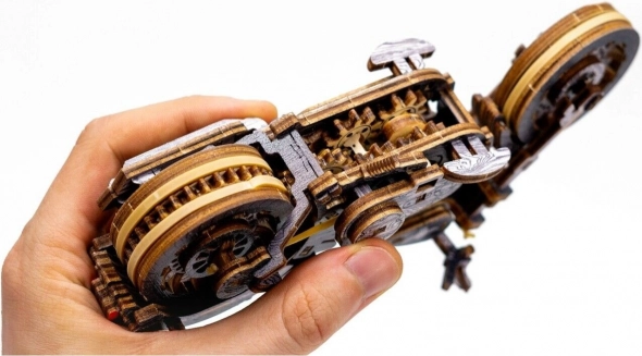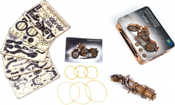 Drvena 3D slagalica WOODEN CITY Cruiser V-Twin nudi autentično iskustvo izgradnje mehaničkog modela bez korištenja ljepila ili alata. Ovaj model je izrađen od ekološke brežove šperploče i sadrži funkcionalne detalje pravog motocikla. Model motocikla nudi: