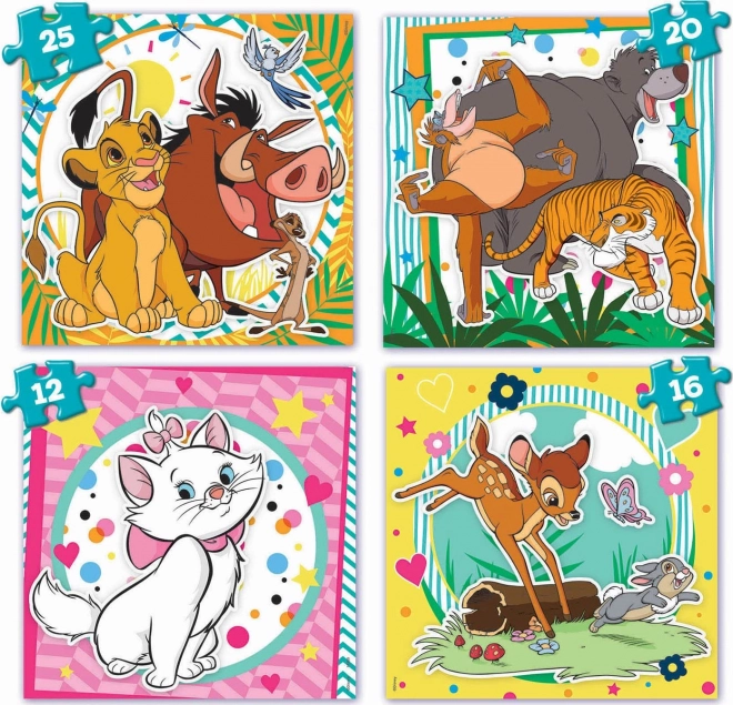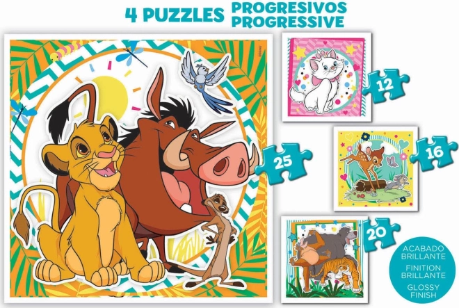 Preslatke dječje puzzle s motivima iz bajki Disney donose četiri slagalice u jednom setu. Progresivna težina (12, 16, 20 i 25 dijelova) pomaže djeci poboljšavati vještine korak po korak. Dio pakiranja je i praktični plastični koferčić za lako prenošenje i odlaganje. Svaka složena slagalica ima dimenziju cca 16 × 16 cm.