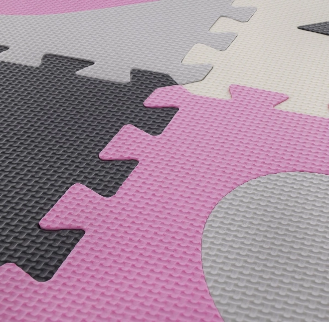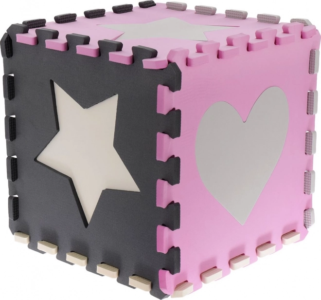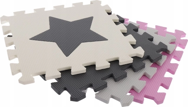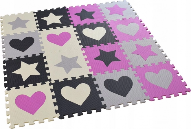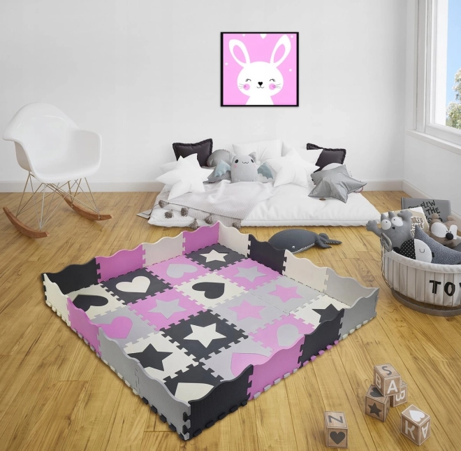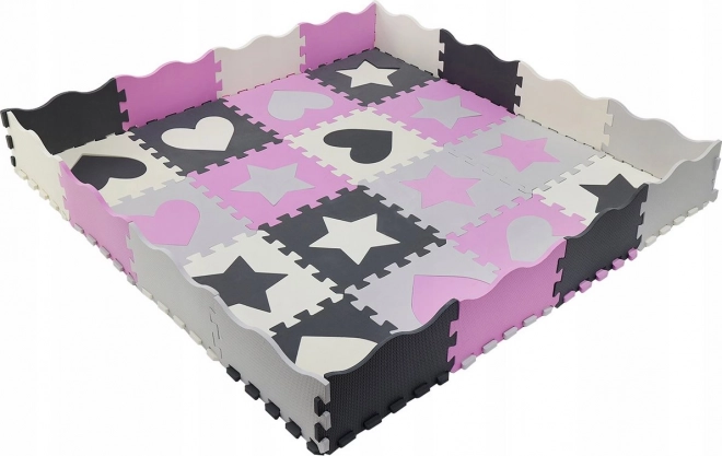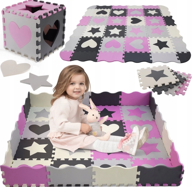 Stilna pjenasta podloga s motivom srca i zvijezda u ružičastoj i sivoj boji stvara djeci od 3 godine sigurno i udobno mjesto za igru. Dijelovi se lako spajaju, podloga je mekana, periva, prigušuje buku i izolira od hladnoće. U pakiranju su i rubni te kutni dijelovi za uredan završni rub.