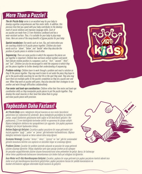 Ovaj set „Boje i oblici” iz linije Art Kids Baby donosi 6 različitih obrisa koji motiviraju djecu na upoznavanje svijeta boja i osnovnih geometrijskih oblika. Jednostavne 2-dijelne kombinacije idealne su za prve puzzle, jačaju strpljenje i uče djecu pravilno uparivati parove.