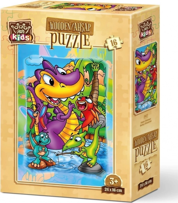 Zabavne drvene puzzle s motivom dinosaura na pecanju razveselit će male graditelje i početnike. Sadrži 16 čvrstih dijelova od tanke drvene šperploče, a nakon slaganja ima veličinu cca 16 × 24 cm.