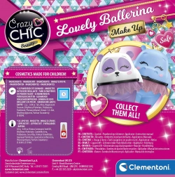 Preslatki dječji make-up set CLEMENTONI CRAZY CHIC u kompaktnoj kutijici nilskog konjića balerine sa zlatnom krunom razveselit će sve male šminkerice. Nudi nježne nijanse za prirodan, uvijek moderan izgled i sve potrebno: sjenila za oči, ruž i aplikator. Uključene su upute, a inspiraciju je moguće pronaći i u online tutorijalima. Zahvaljujući dimenzijama 7,5 × 6 × 8 cm stane u ruksak i na policu, a pritom je dio kolekcionarske edicije s mladuncima.