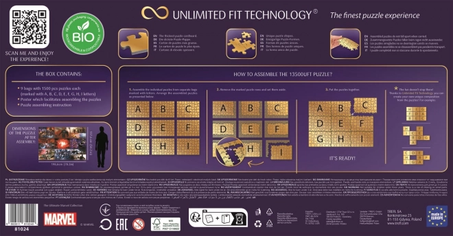 Zadivljujuće puzzle koje prikazuju avanture junaka iz Marvelova svemira. Svaka slika je pakirana zasebno (9x1500 dijelova). Zahvaljujući tehnologiji TREFL Unlimited Fit Technology (UFT), koja omogućuje povezivanje pojedinih slika međusobno, možete stvoriti proizvolnu kompoziciju slika ili se držati rasporeda prema predlošku.