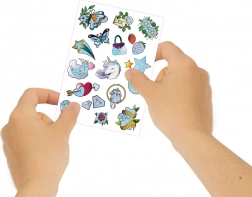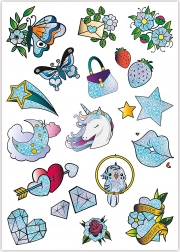 Set Crazy Chic Sjajna Tetovaža sadrži širok izbor dizajna, uključujući jednoroge, leptire i druge motive. Tetovaže se lako nanose i dermatološki su testirane.