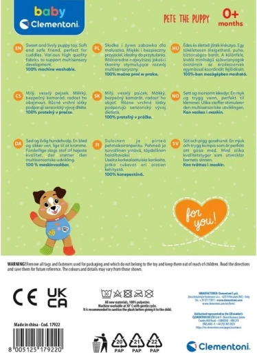 Psić je zapakiran u elegantnu poklon-kutiju, prikladnu i za pohranu i kao kreativna kućica za plišanca. Materijali korišteni u proizvodnji netoksični su i izdržljivi, što osigurava trajnost i sigurnost tijekom igre. Igračka se može prati u perilici rublja na maksimalnoj temperaturi od 30°C, na programu za osjetljivo rublje.