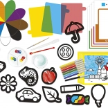 Sadrži alate i modele poput kistova i flomastera za praktično učenje.