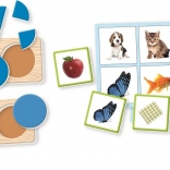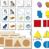 Set sadrži kartone s osnovnim bojama za pridruživanje i imenovanje, taktilne kartone s različitim teksturama (baršunasta, hrapava, glatka) za razvoj taktilne percepcije te polje „pojavi se i nestane” za umetanje žetona različitih geometrijskih oblika, što potiče razumijevanje postojanosti predmeta.
