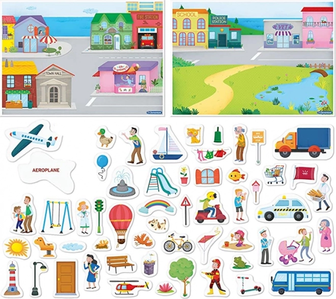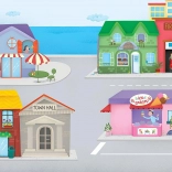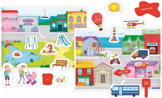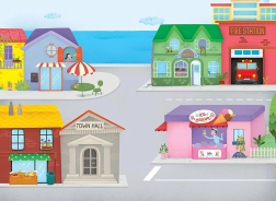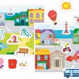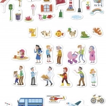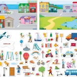 Dvije bogato ilustrirane scene potiču pripovijedanje i vježbanje rječnika o mjestima, zanimanjima, prijevozu i životinjama.