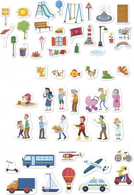 Paket sadrži 55 slikovnih dijelova s riječima koje djeca mogu više puta kombinirati i stvarati nove situacije.