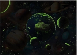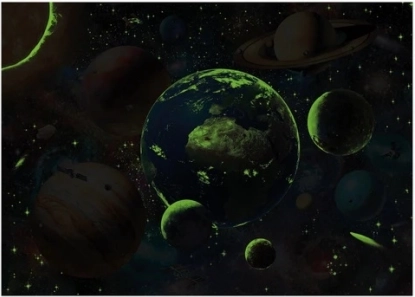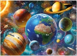 Neonski dijelovi puzzli otkrivaju prekrasnu sliku planeta s detaljnim elementima, uključujući Saturn i Zemlju.