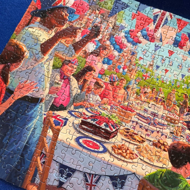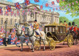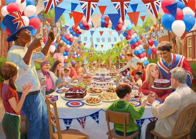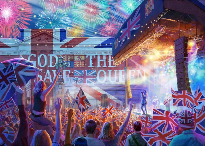 Otkrijte set od 4 zasebne slagalice koje slave Britaniju: Derby na Epsom Downsu, koncert kod palače, vožnju kraljevske kočije tijekom Trooping the Colour i živahnu ulično proslavu. Svaka slagalica ima 500 dijelova i nakon slaganja mjeri oko 49 × 34 cm; u pakiranju se nalaze i predlošci motiva.
